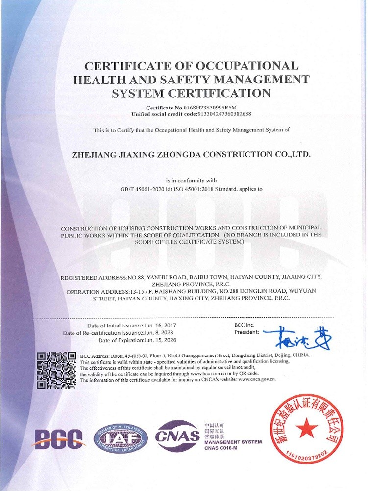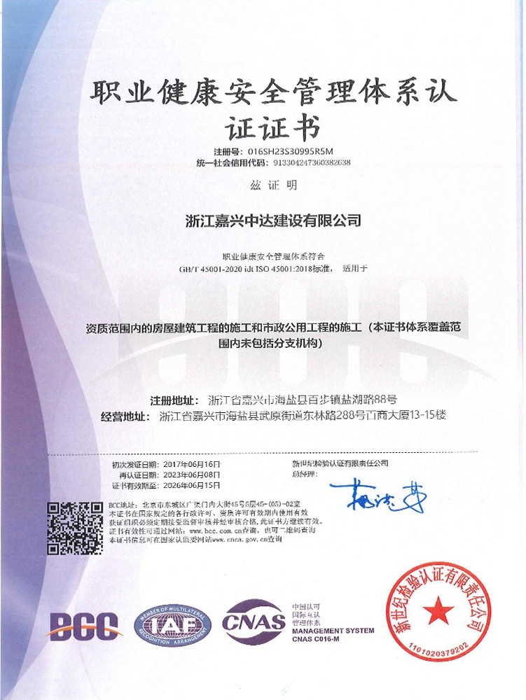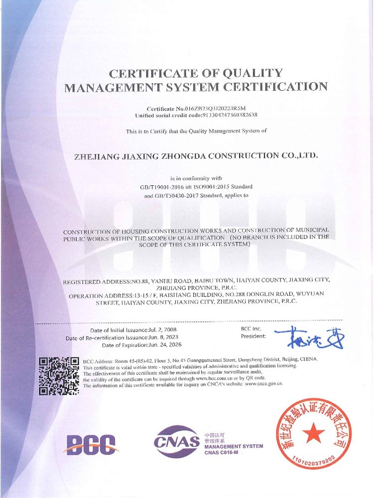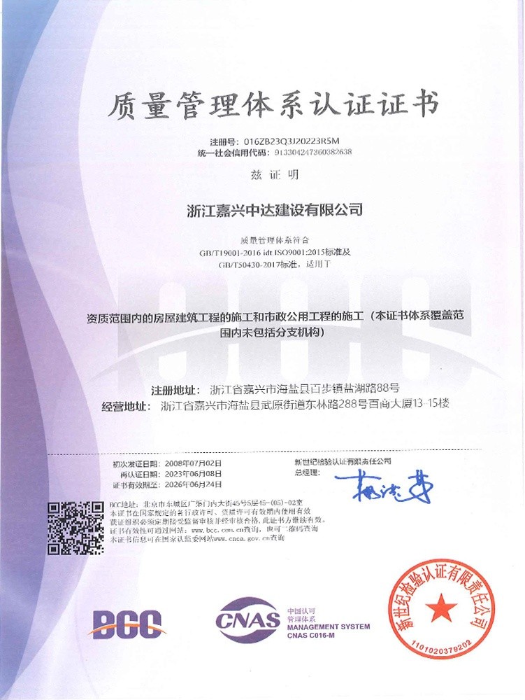 公司始終堅(jiān)持“質(zhì)量為本、規(guī)范施工、遵紀(jì)守法、持續(xù)改進(jìn)”的管理方針,全面實(shí)施ISO9001、GB/T50430質(zhì)量、ISO14001環(huán)境和GB/T 28001職業(yè)健康安全體系標(biāo)準(zhǔn),提高現(xiàn)場(chǎng)質(zhì)量、安全生產(chǎn)、文明施工管理水平,積極推進(jìn)創(chuàng)優(yōu)奪杯活動(dòng),努力打造一流品質(zhì)工程,先后獲得了浙江省建筑安全文明施工標(biāo)準(zhǔn)化工地、浙江省智慧工地示范項(xiàng)目、嘉興市“南湖杯”優(yōu)質(zhì)工程、嘉興市建筑安全文明施工標(biāo)準(zhǔn)化工地等諸多工程榮譽(yù)。公司成立了嘉興市建筑企業(yè)技術(shù)中心,參編國(guó)家級(jí)行業(yè)標(biāo)準(zhǔn)、省級(jí)行業(yè)標(biāo)準(zhǔn),取得省級(jí)工法、發(fā)明專利、實(shí)用新型專利40余項(xiàng)。