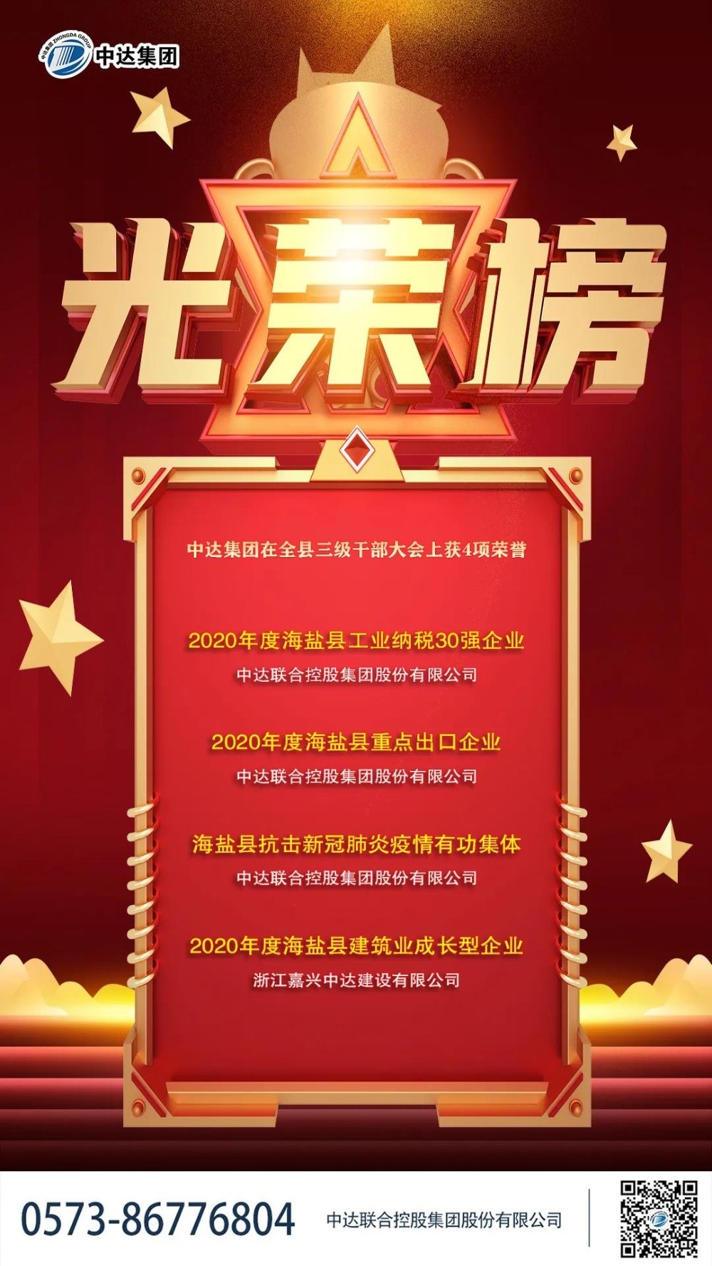 喜訊 | 中達(dá)集團在全縣三級干部大會上獲4項榮譽 2021-02-20 16:00:00 中達(dá)聯(lián)合控股集團股份有限公司 瀏覽次數(shù) 3277 今天上午,海鹽縣召開全縣三級干部大會,會議通報了2020年度海鹽縣鎮(zhèn)(街道)、縣級部門(單位)目標(biāo)責(zé)任制考核結(jié)果、縣委縣政府中心工作先進(jìn)集體和個人等。會上,中達(dá)集團獲得4項榮譽: 上一條開工大吉 | 牛年奮蹄加油干 下一條美麗工廠+ | 中達(dá)集團召開2021干部員工代表大會