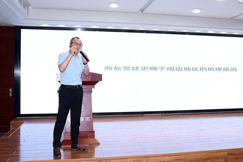 活動(dòng)最后,集團(tuán)文化顧問(wèn)朱逸平為全體團(tuán)員分享了一堂精彩的團(tuán)課《海鹽黨史和千年長(zhǎng)山河》,帶全體團(tuán)員回顧了海鹽的黨史和長(zhǎng)山河的開(kāi)挖歷史,展現(xiàn)了海鹽早期黨員和人民群眾的奮斗歷史。