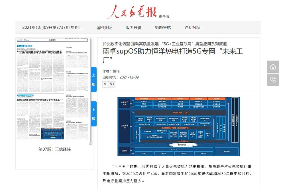 12月9日,《人民郵電》報(bào)刊發(fā)文章《藍(lán)卓supOS助力恒洋熱電打造5G專網(wǎng)“未來(lái)工廠”》,深入闡釋了supOS工業(yè)操作系統(tǒng)如何為恒洋熱電節(jié)能減排,走可持續(xù)發(fā)展道路。