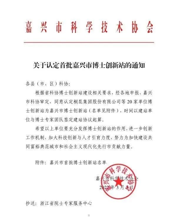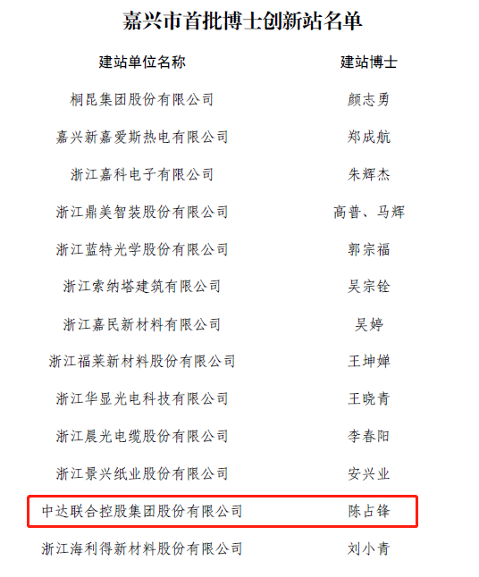 近日,市科協(xié)下發(fā)《關(guān)于認(rèn)定首批嘉興市博士創(chuàng)新站的通知》,中達(dá)集團榜上有名,成為市級首批博士創(chuàng)新站。