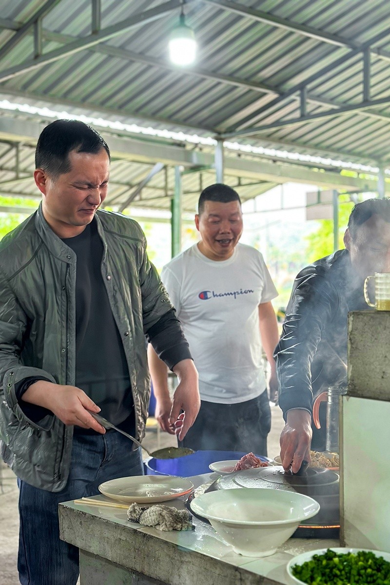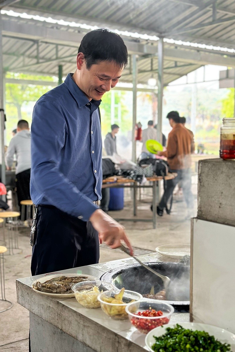 中午,大家按需求和個(gè)人所長(zhǎng)分工合作,前期準(zhǔn)備、中間烹調(diào)、后期衛(wèi)生保潔都有條不紊,事務(wù)瑣碎、工程浩大的土灶燒野米飯極富樂趣。伴隨著柴火燃燒的噼里啪啦聲,大廚們展示出不同的料理方式和技藝,土灶成為閃亮的表演舞臺(tái)。濃濃的香味刺激著味蕾,大家吃著野米飯、喝著飲料,你一言、我一語(yǔ)地聊著工作和生活中遇到的各種趣事,其樂融融。