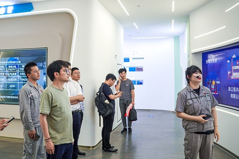 活動(dòng)伊始,恒洋熱電安環(huán)部經(jīng)理吳文濤帶大家參觀了展廳。展廳講解員朱婷為大家介紹了恒洋熱電企業(yè)文化展區(qū)、熱電詳解區(qū)、環(huán)保能源展區(qū)、大數(shù)據(jù)智慧電廠平臺、知識科普展區(qū)五大特色區(qū)域,在講解員細(xì)致生動(dòng)的講解下,大家對恒洋熱電的發(fā)展戰(zhàn)略和企業(yè)愿景有了進(jìn)一步的了解。隨后,吳文濤進(jìn)一步為大家講解了恒洋熱電的綠色化發(fā)展,講述了碼頭蝶變、智慧電廠、節(jié)能技改等企業(yè)突破的故事。