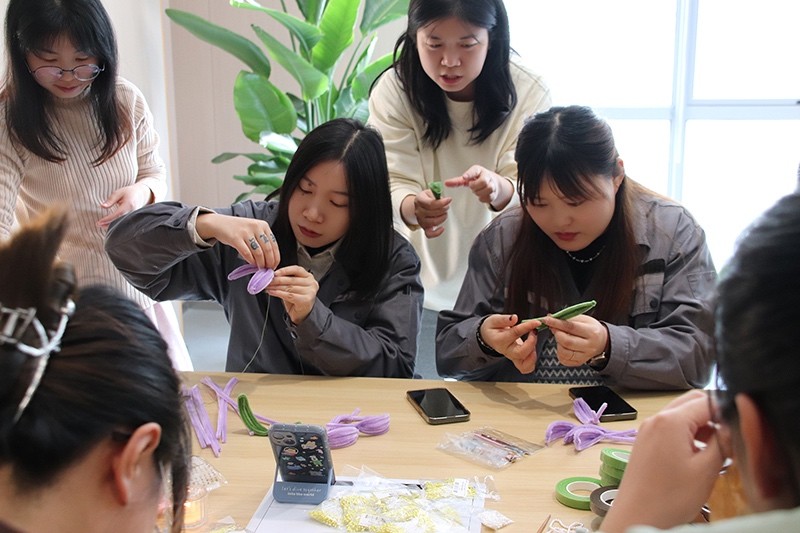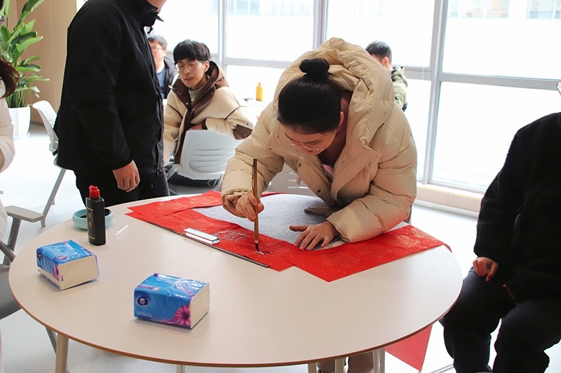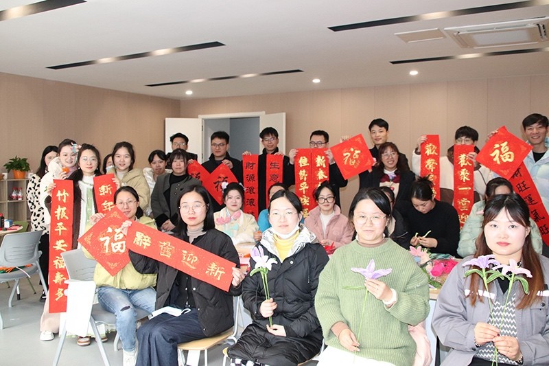 在“玩”的環(huán)節(jié),大家學(xué)習(xí)了絨花國風(fēng)發(fā)簪的制作,三位老師向員工們?cè)敿?xì)講解絨花的制作過程,包括所用工具、材料及其用途等。絨花作為中國傳統(tǒng)的手工藝品之一,有著悠久的歷史,是中國非物質(zhì)文化遺產(chǎn)寶庫中的組成部分。員工們爭(zhēng)相體驗(yàn),一根根絨花棒在大家手中變成了一朵朵活靈活現(xiàn)的花,讓大家親身體驗(yàn)到了傳統(tǒng)文化的魅力。隨后,大家還學(xué)習(xí)了紙漿畫的制作,它以紙漿為主要材料,顏色鮮艷,具有浮雕效果?;顒?dòng)將冬季的六個(gè)節(jié)氣通過紙漿畫的形式呈現(xiàn)出來,大家小心翼翼地用竹簽和鑷子為各自的圖案上色,“立冬”“小雪”“大雪”“冬至”“小寒”“大寒”,一幅幅生動(dòng)立體的冬季節(jié)氣紙漿畫作品呈現(xiàn)在大家眼前。此外,更有幾位對(duì)書法感興趣的青年拿起了毛筆躍躍欲試,將美好的祝福寫在春聯(lián)上。