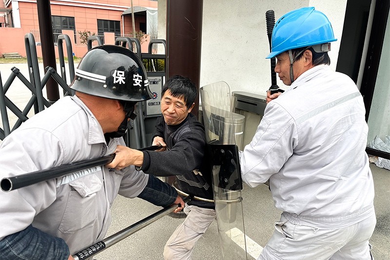 隨后,演練正式開始。由一名檢修班員工扮演“可疑人員”,試圖強(qiáng)行闖入廠區(qū),應(yīng)急預(yù)案立即啟動(dòng)。值班保安員馬上穿戴好防暴工具,手持防爆盾、鋼叉等器械,迅速趕赴現(xiàn)場(chǎng)。在大家的默契配合下,安保人員成功將“歹徒”合圍至門衛(wèi)室護(hù)欄上,并最終將其制服。